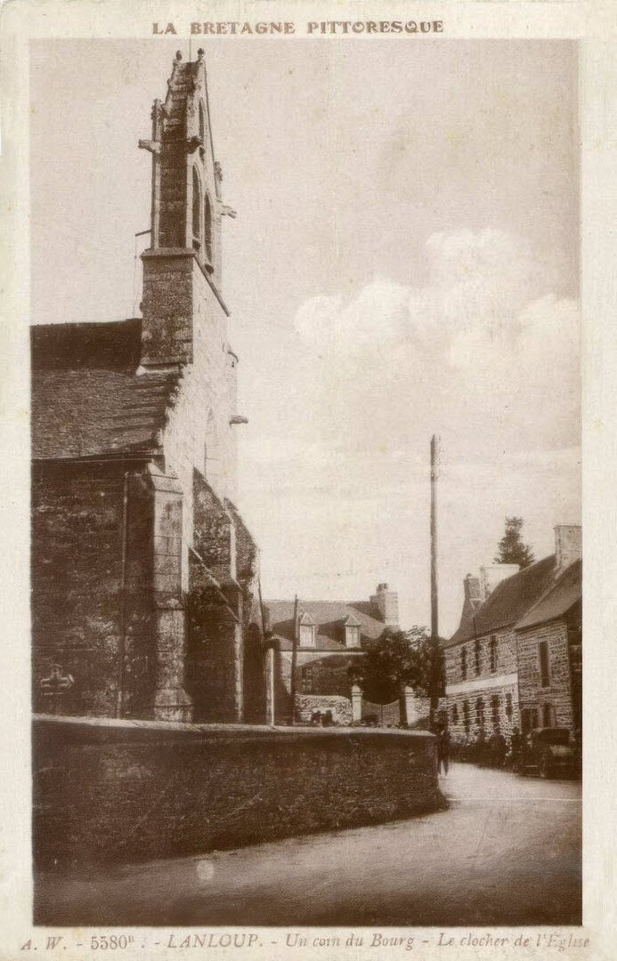 La carte n⁰ 700 est réminiscente du cliché Hamonic pris à partir du porche de l'église. En arrière-plan, le bâtiment qui est aujourd'hui l'emplacement de la mairie de Lanloup est encore le presbytère. Pour une présentation détaillée de l'histoire de l'église, des saints de son porche, de ses statues, voir le fascicule de l'abbé Jean Le Floc'h en bas de la page Infos sur Lanloup ici.