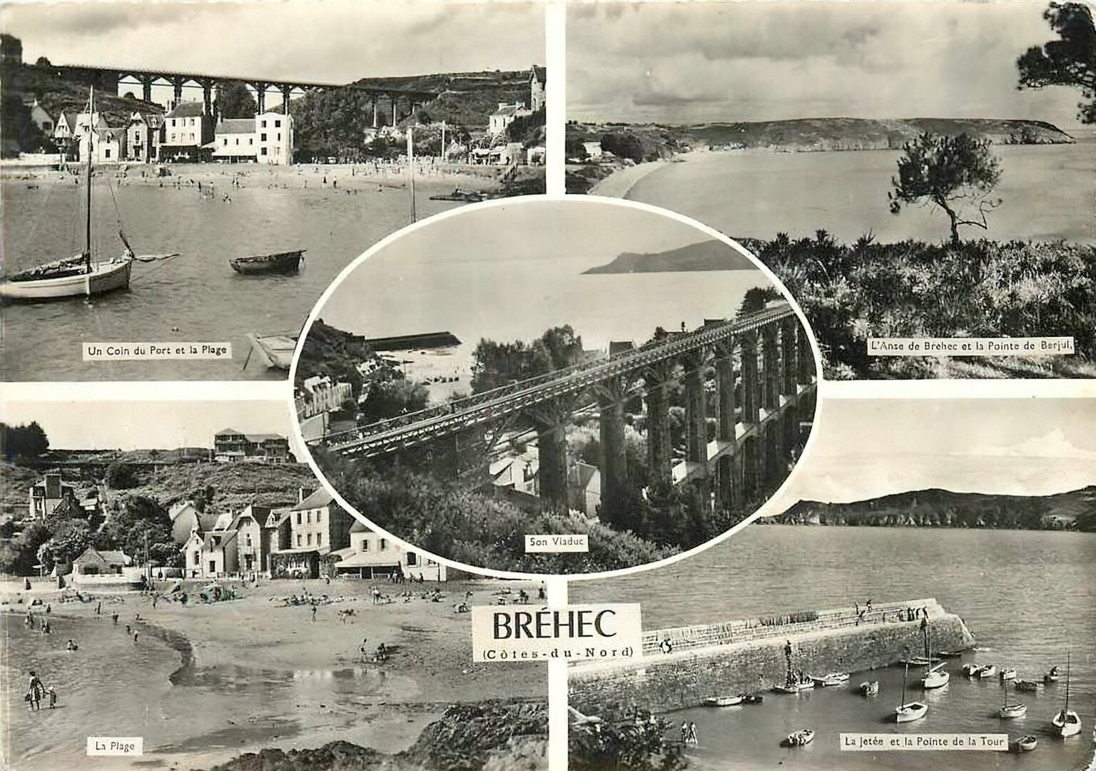 Chez l' éditeur Yvon, il existe deux séries sur Bréhec dont certaines cartes en commun dans ma collection. Tout d' abord, celle d'un bateau au premier plan dans le port avec le viaduc en arrière-plan, les deux cartes étant intitulées la Plage et le Viaduc. Ensuite, la même carte du même bateau vu de travers, l' une en couleur et l' autre en noir et blanc. Les premières cartes de cette liste sont référencées B.35xx, puis elles deviennent I.B.25xx, toujours avec la mention photo véritable. La différence est que la série B. est au format 9x14, tandis que l' I.B. est dentelée et au format 10x15 cm.