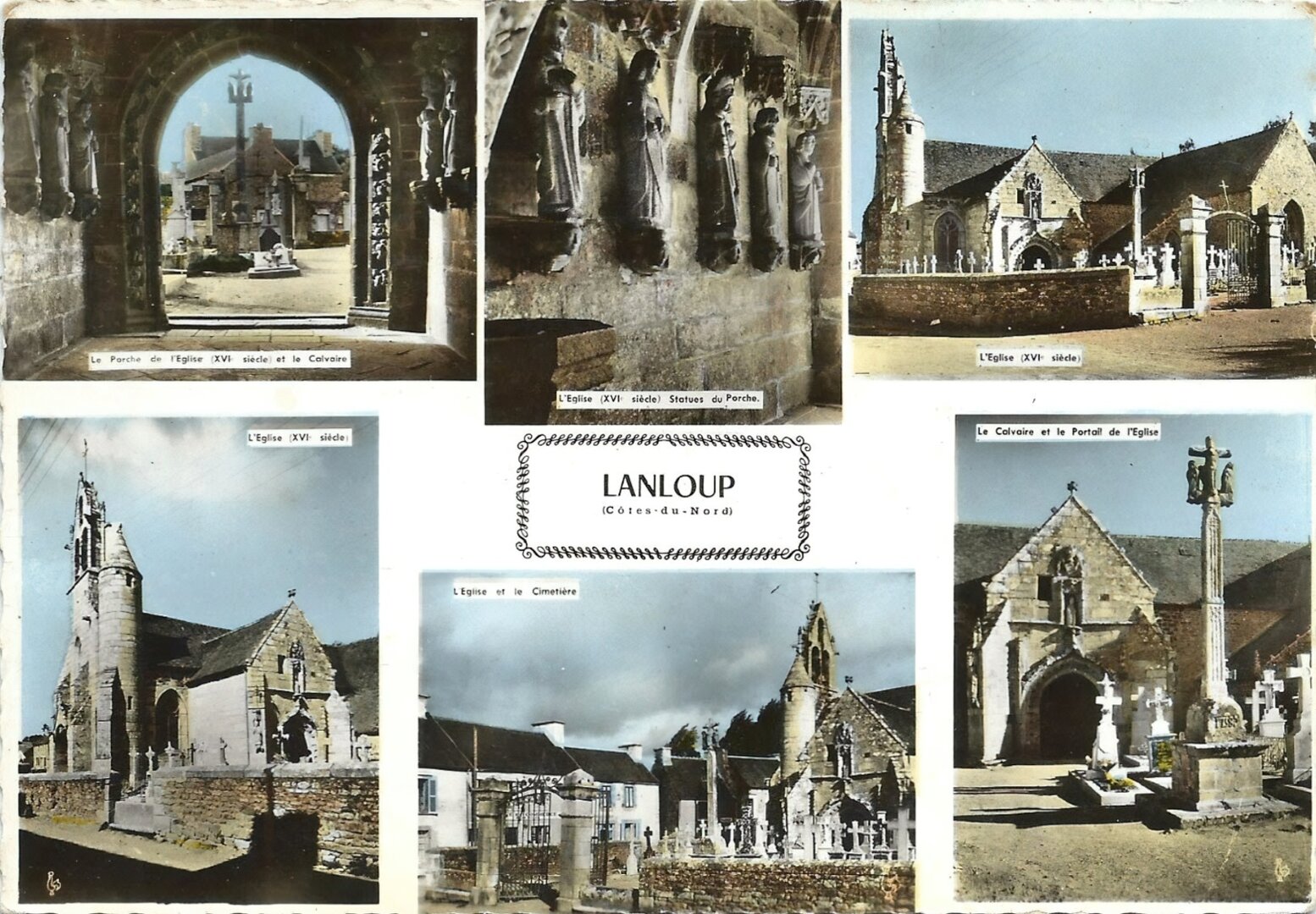 À ma connaissance, la première carte de ce petit diaporama est la seule où l' on peut voir le portique de Maurice Bertau, le professeur d' éducation physique et sportive qui animait le Club de plage jusqu' au début des années 70. La quatrième carte est également intéressante en ce qu' elle montre l' ancien emplacement de la mairie de Lanloup, proche de la boucherie de Jean Le Gall, qui fut maire de 1959 à 1971, puis de 1977 à 1983. Enfin, j' ai un faible pour la dernière carte, celle de l' église de Lanloup, que je juge être la meilleure parmi les clichés pris de l' intérieur du porche.