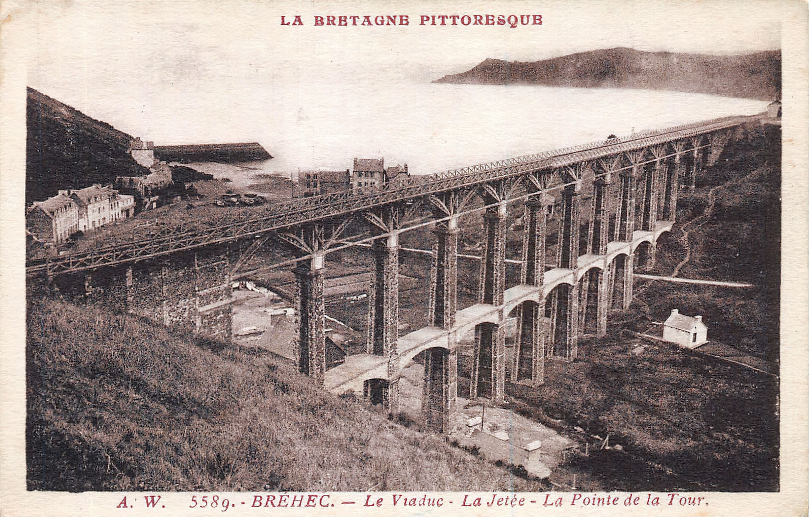 La carte n⁰ 720 nous montre la halte de Bréhec, un type de petite construction standard que l'on retrouve utilisé pour tous les arrêts du Petit Train entre Saint-Brieuc et Paimpol. Cette carte montre que la route de la Corniche est encore très étroite puisque l' on aperçoit le balcon en béton de la terrasse de l' Hôtel Beau Rivage à droite. Une vue à comparer à celle de la carte n⁰ 656 de Couée supra. La maison Le Page figure en contrebas.