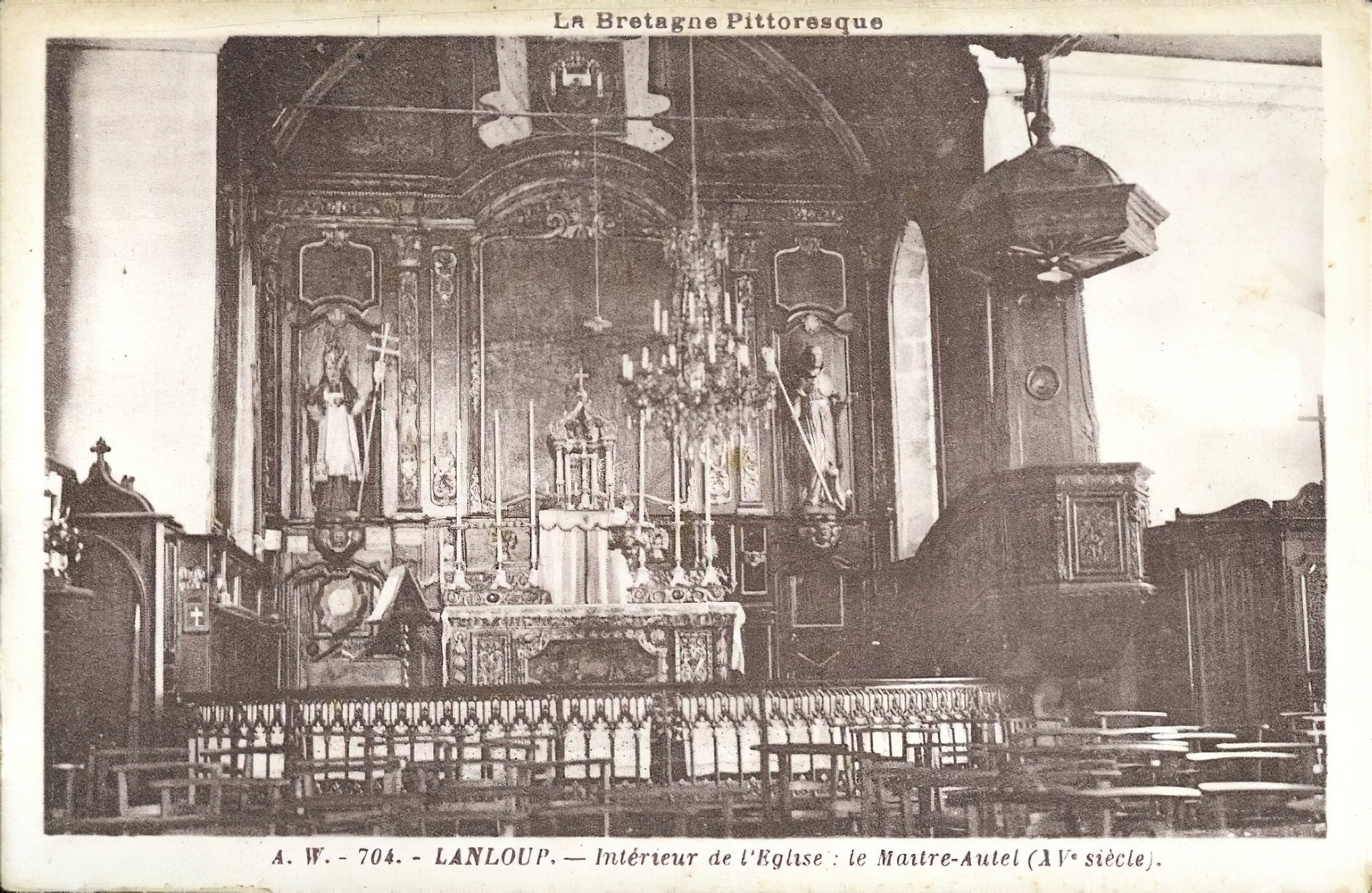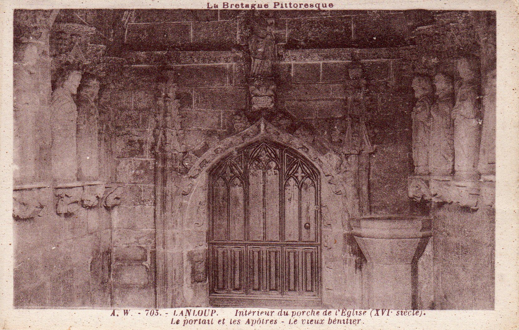 La carte n⁰ 700 est réminiscente du cliché Hamonic pris à partir du porche de l'église. En arrière-plan, le bâtiment qui est aujourd'hui l'emplacement de la mairie de Lanloup est encore le presbytère. Pour une présentation détaillée de l'histoire de l'église, des saints de son porche, de ses statues, voir le fascicule de l'abbé Jean Le Floc'h en bas de la page Infos sur Lanloup ici.