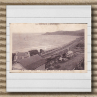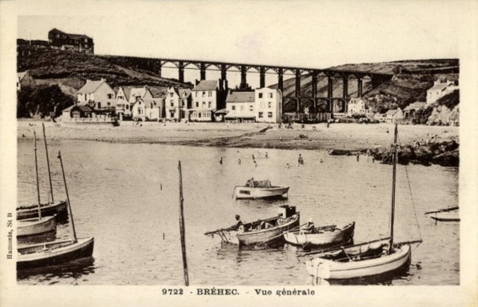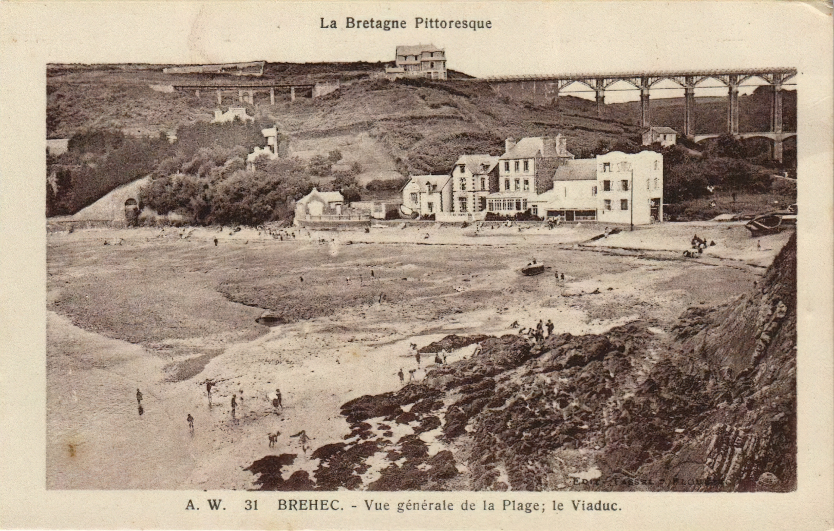 Du n⁰ 755 au n⁰ 759, les cartes nous offrent un bel aperçu d' ensemble de Bréhec à cette époque, avec le détail de la traversée du viaduc, du chemin de la digue, et de l' arrivée sur la plage avec son terre-plein central, boulodrome, tennis...
