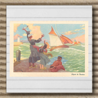 Le deuxième diaporama est une série de 10 cartes représentant des scènes bretonnes typiques. La date de circulation la plus ancienne observée est 1952, ce qui confirme une édition en début de décennie. En revanche, les aquarelles me semblent avoir été peintes dans un style plus réminiscent des années 30/40.