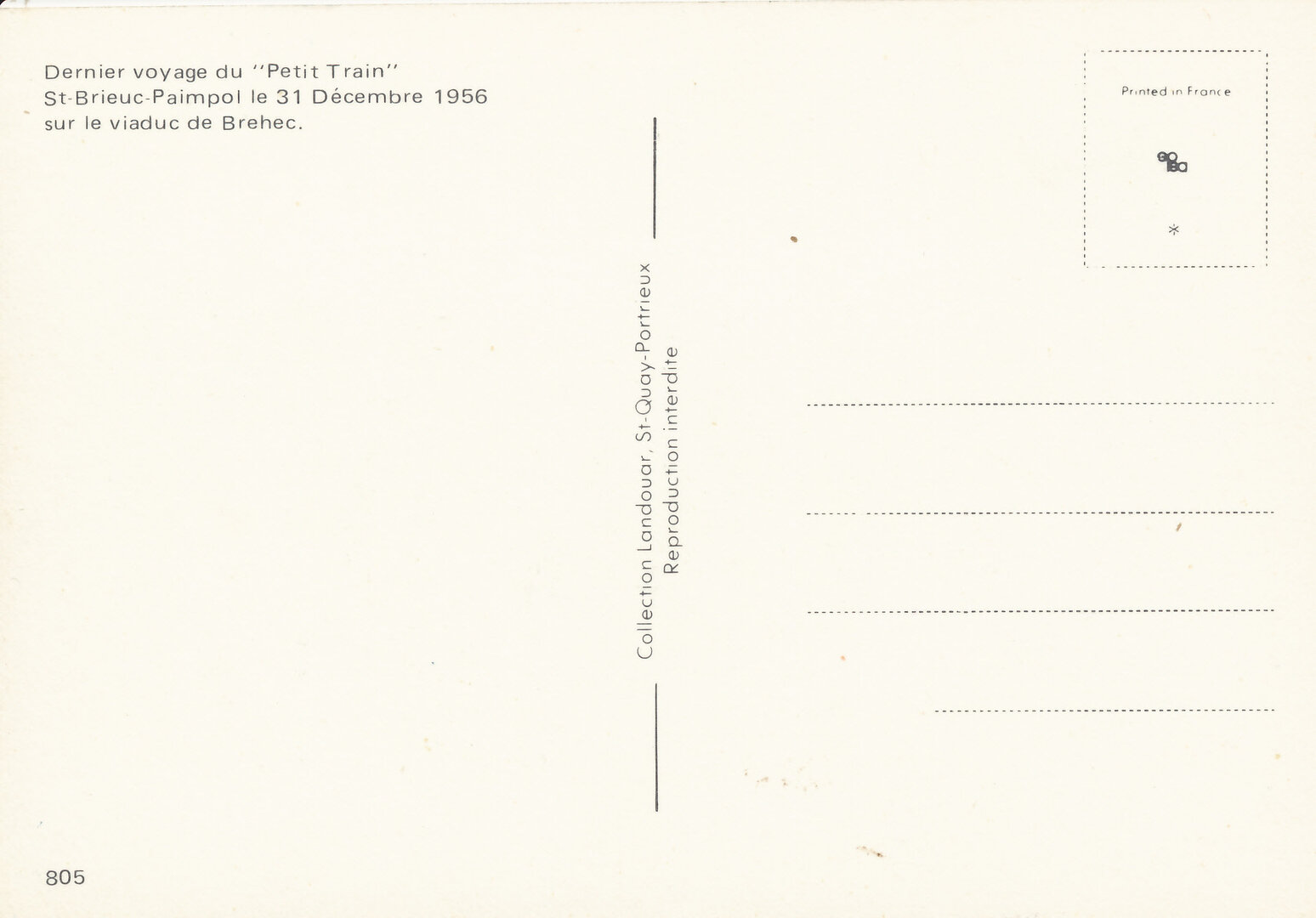 La carte Landouar qui montre Lulu parée de drapeaux sur le viaduc de Bréhec est un cliché du 31 décembre 1956 puisqu' il marque le dernier voyage du Petit Train. La preuve existe par recoupement avec les films amateurs tournés ce jour-là, que vous pouvez visionner à la page sur le Petit Train ici.