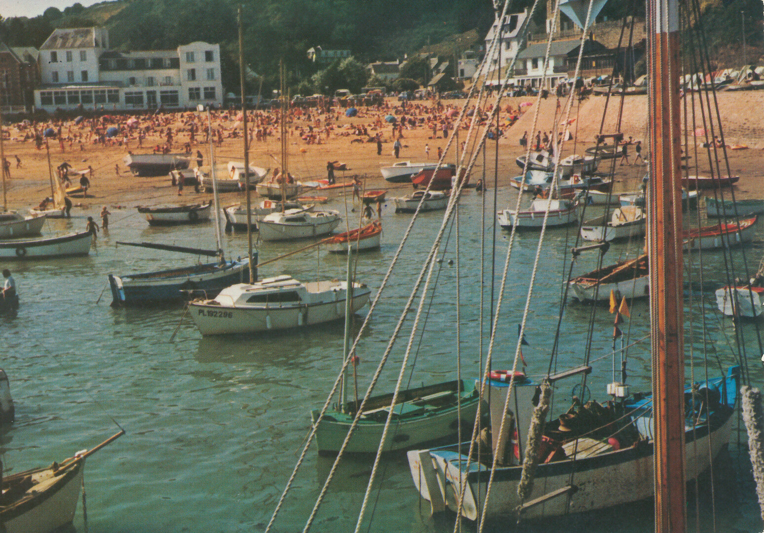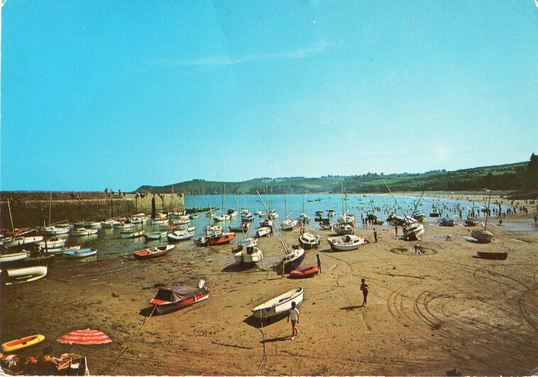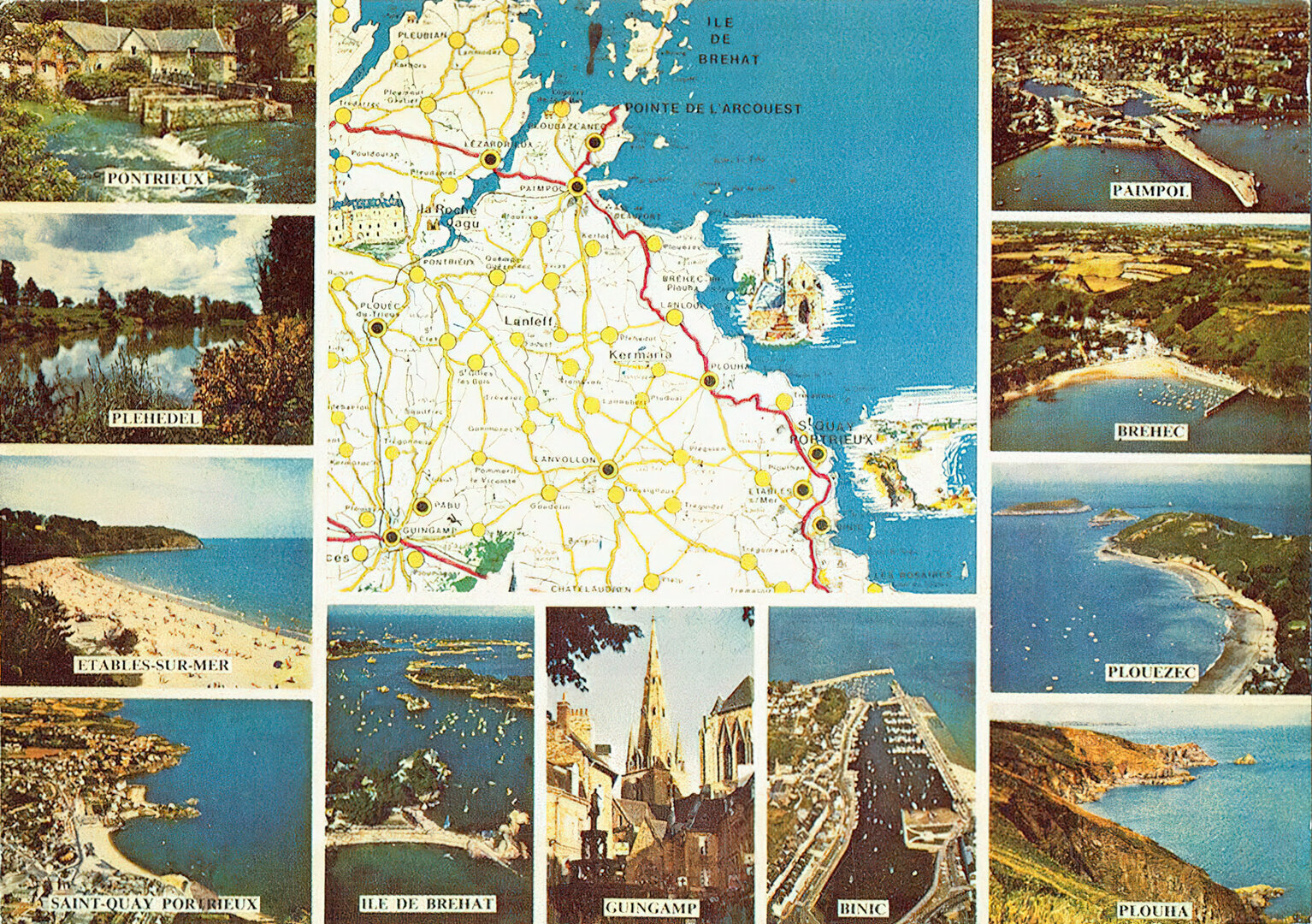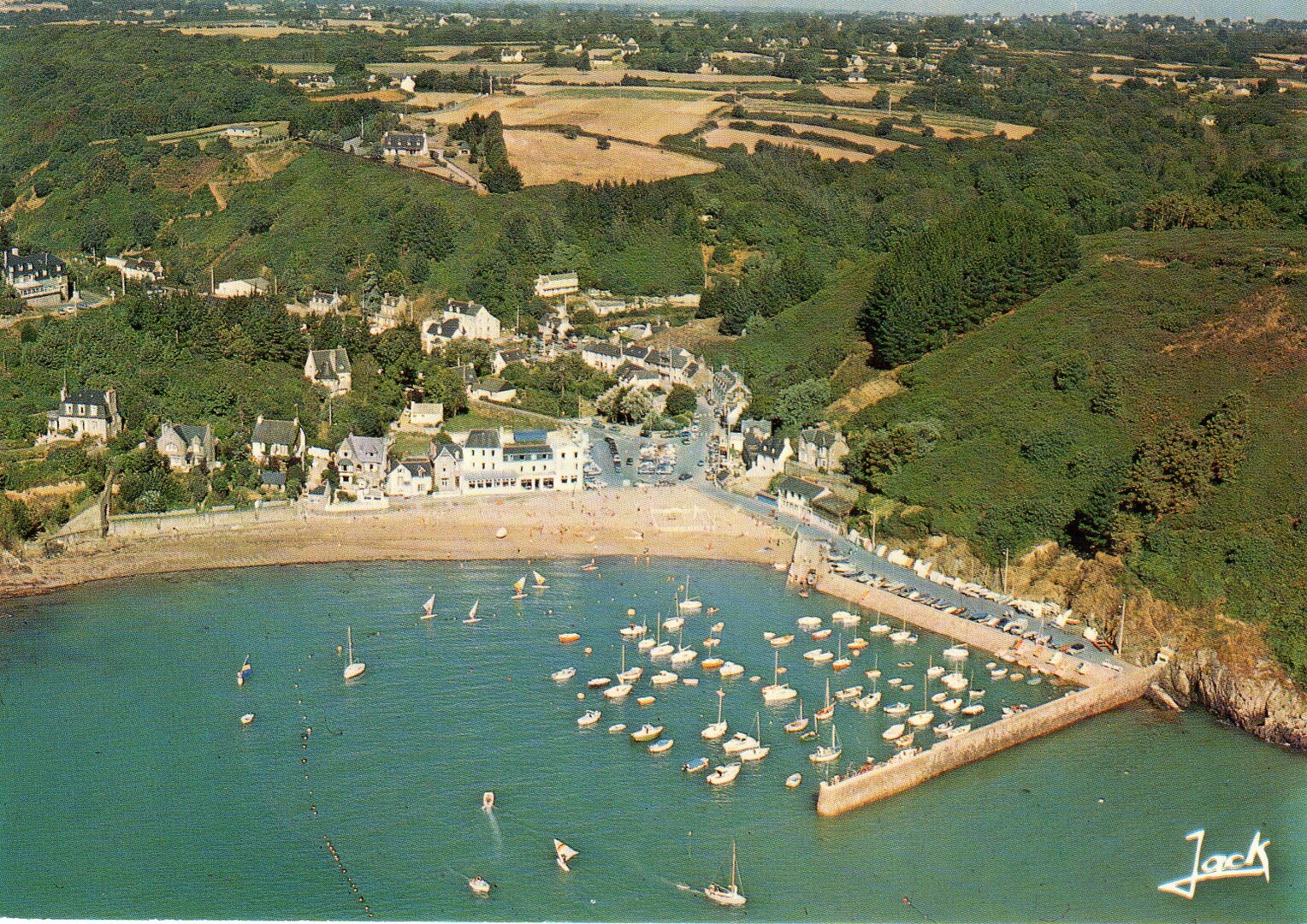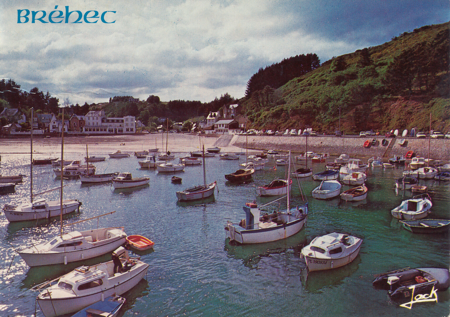 La première carte de cette série fut prise un jour où se tenait un événement organisé par l'association Bréhec-Loisirs, comme en témoigne les chapiteaux dressés sur le parking central et sa petite annexe utilisée par le CVB (voir l'historique du Centre de Voile dans la section Anecdotes ici). Certains détails permettent de dater cette carte à la première partie de la décennie : le Club de Plage est installé sur la plage et deux terrains de boule bretonne sont encore disponibles derrière l' Hôtel de la Plage. Les planches à voile sur l' eau sont également typiques de cette époque. Quant à elle, la deuxième carte est intéressante en ce qu' elle montre bien l' étendue de la colonie de vacances au Vieux-Bréhec. Cela fait une éternité qu' on ne l' a pas vue comme ça ! Enfin, la carte de l' église de Lanloup fait partie d'une série de l' éditeur Jos sur les peintres de Bretagne. Cette aquarelle de 1989 est une œuvre du peintre Hubert Coatleven.