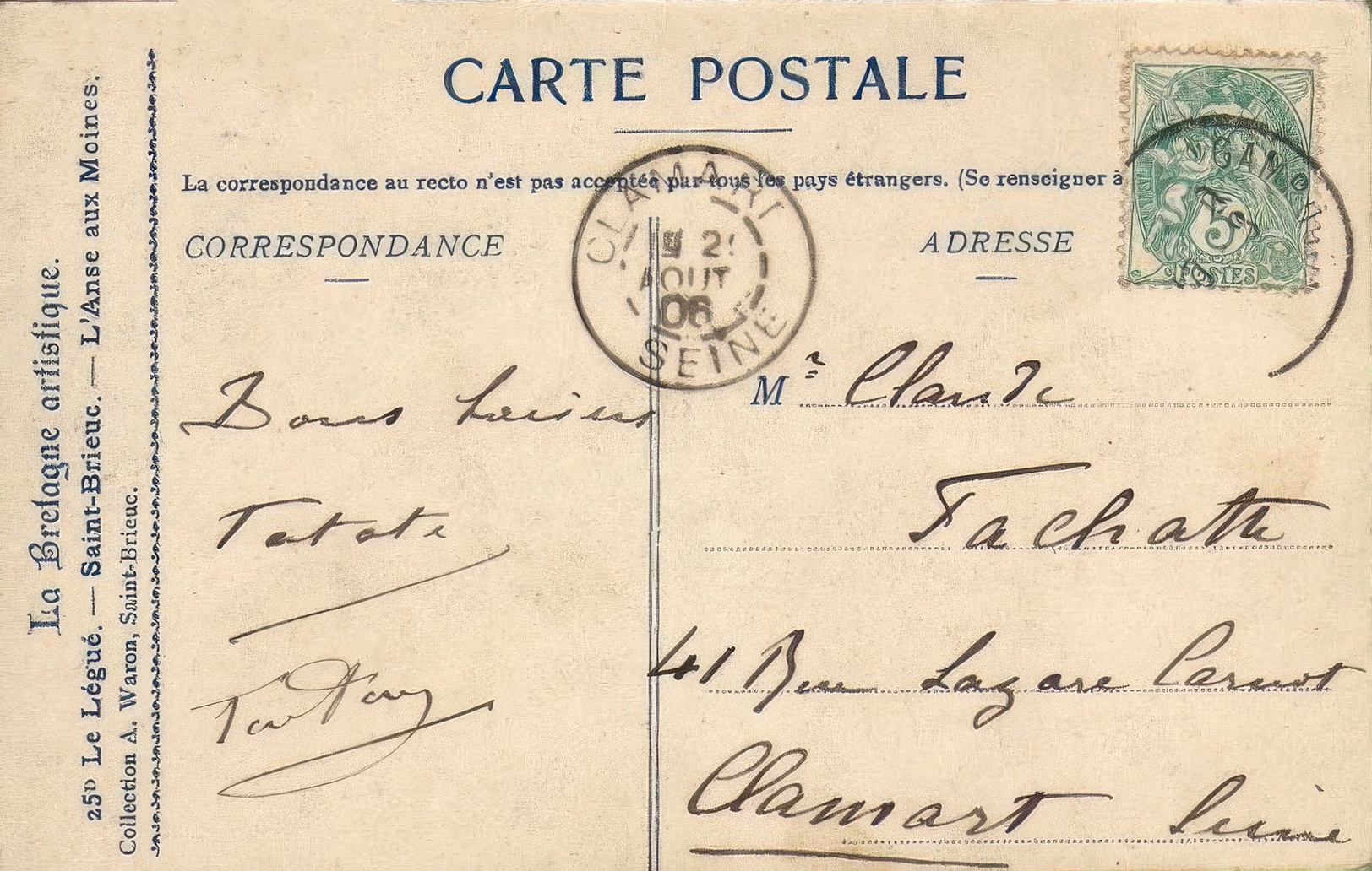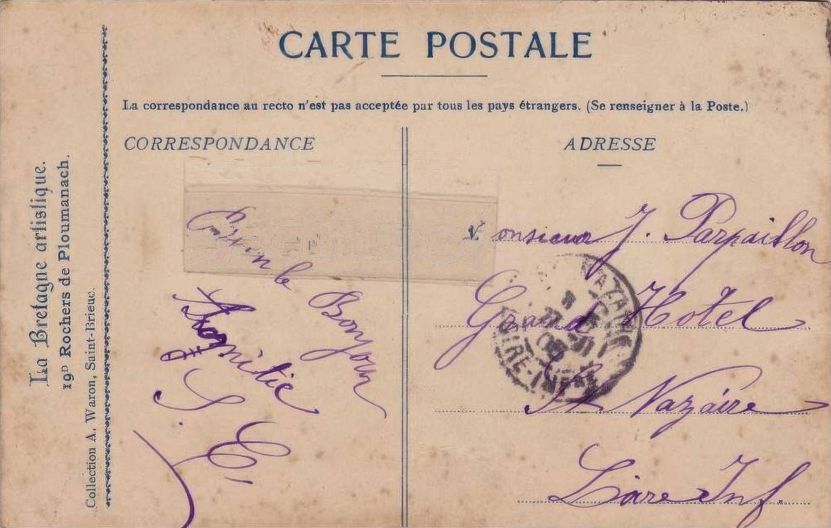 Pour en terminer avec les quelques autres collections de Waron, je place un dernier diaporama avec quelques exemples de cartes postales dites 'fantaisie' ainsi que deux exemplaires de la collection Marine Militaire Française. Comme bon nombre d' éditeurs, Waron publie des cartes génériques du genre 'pensée de' ou 'souvenir de' qui permettent à un Briochin de vendre des cartes postales à Lorient ou Vitré, des collages réalisés à base de cartes de la ville mentionnée, et quelques séries disparates telles Les confetti ou Les cinq sens. Toutes ces cartes datent de la première décennie du siècle.