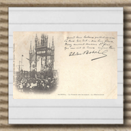 Prendre l' année 1899 en tant que point de départ de la carrière d' éditeur de Waron, cela correspond aux exemplaires en ma possession circulés cette année-là. Néanmoins, la carte ci-contre référencée 75. - Paimpol. - Pardon des Islandais indique la mention manuscrite Septembre 98, et en violet de surcroît, couleur d'encre très présente sur les cartes de type précurseur et celles du début du siècle. La carte n'ayant pas circulé, cette date ne peut être celle du cliché puisque le pardon des Islandais, instauré en 1855 et supprimé en 1871, se déroulait le deuxième dimanche de février entre 1883, année de son rétablissement, jusqu' à 1903, date du dernier pardon puisqu' en 1904 la cérémonie devient profane pour devenir la fête profane des Islandais et du commerce. Néanmoins, elle pose question. En l' absence d' une carte avec marque postale ou affranchissement de 1898, la date de 1899 est, quant à elle, avérée par les deux exemplaires ci-dessus, et reste la référence pour parler des débuts de Waron dans l' édition. J' ai également en ma possession une autre preuve documentaire, donnée par Waron lui-même et non par la marque postale ou la date indiquée par l' expéditeur. Il s' agit ici d'une mention manuscrite de Waron sur son cliché du Mur des disparus en mer du cimetière militaire et mémorial de Ploubazlanec où des panneaux de bois appelés 'Mémoires' perpétuent le souvenir des marins disparus lors du naufrage de leur goélette partie pour la campagne d' Islande. L' exemplaire ci-contre, qui fait partie des cartes non numérotées, a circulé en 1900. L' agrandissement du premier plan en bas à gauche montre la mention A. Waron 1899. C' est d' ailleurs l' une des rares cartes que je possède où l' on peut voir une mention manuscrite de Waron sur le cliché ! Les deux autres dans ma collection sont le jubé de Notre-Dame de Lamballe et la jeté de Binic (diaporama des premières cartes postales ci-dessous). Ce cliché de 1899 sera repris avec plusieurs numérotations : 71, et trois exemplaires 'Botrel' numérotés 15b, 75b et 85b, dont un exemplaire 15b avec le cartouche éphémère Waron (cf. infra).