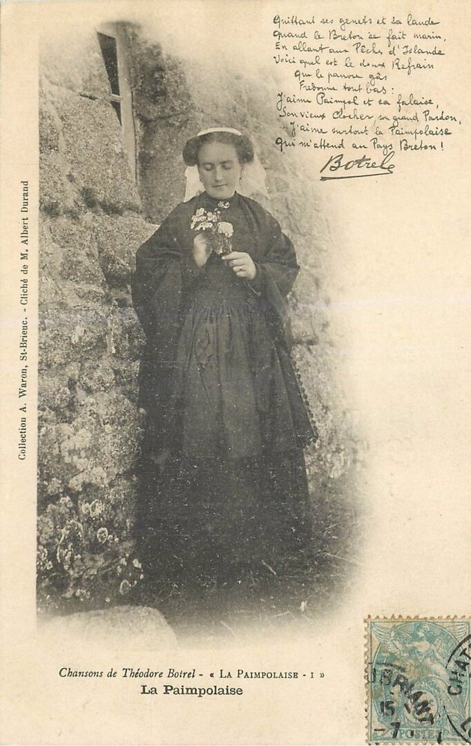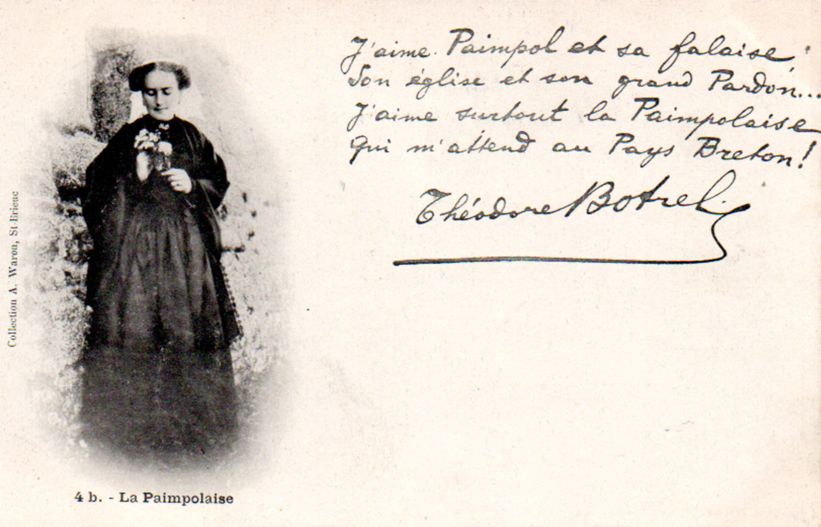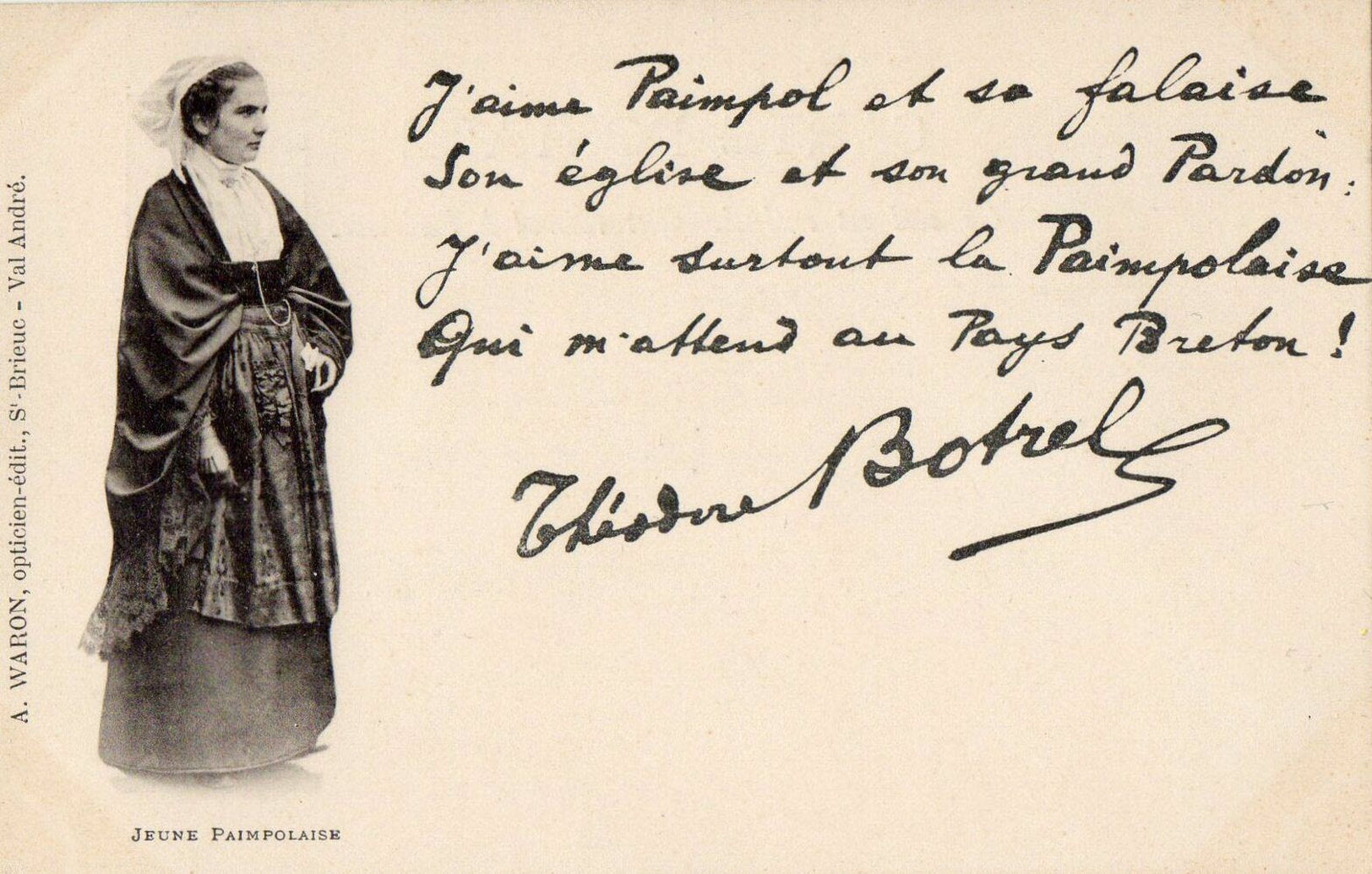 Toujours dans cette période de ses débuts d' éditeur, on trouve des cartes reprenant des textes écrits par Théodore Botrel (1868-1925), rendu célèbre grâce à sa chanson folklorique La Paimpolaise créée en 1895. Pour plus d' information sur Botrel, voir Jean-François Botrel, « Théodore Botrel, chansonnier politique », in D. Leloup, M.-N. Masson (dir.), Musique en Bretagne. Images et pratiques. Hommage à Marie-Claire Mussat, PUR (Rennes), 2003, p. 149-159, consultable ici. Voir également Katell Mouazan, Enquête sur le véritable Théodore Botrel, 2018, (ISBN 978-2-9564897-0-2). Quelques exemples des premières cartes Waron avec textes de Botrel, dont ce dernier se servira pour sa publicité (carte n⁰ 2 avec autographe). Tout comme Hamonic, également très lié avec Botrel dont il fera le sujet de diverses séries (Botrel à Port-Blanc, Botrel au Canada, Les chansons de Botrel...), les premiers clichés ne sont pas numérotés (carte n⁰ 3 à 5 et série La Paimpolaise) mais ils le deviennent rapidement, certains étant réutilisés ultérieurement. Pour exemple, la Paimpolaise du cliché d' Albert Durand, et carte n⁰ 1 de la série de 6, qui se retrouve dans les clichés des cartes n⁰ 18 (4b) et 19 (1004). À ce propos, certaines cartes sont identifiables à la période de la fin du 19e siècle, tout début du 20e, en ce qu' elles mentionnent le photographe, ce dernier disparaissant des éditions ultérieures. Autre signe caractéristique des cartes Waron, mais aussi de celles d' Hamonic, la mention en breton au dos des cartes, laquelle disparaît dans la deuxième moitié de la décennie (voir à ce sujet ma page sur la Datation des cartes postales anciennes ici). C' est le cas dans la série La Paimpolaise du diaporama (cartes n⁰ 6 à 15) et les dos des cartes n⁰ 10 et 13 qui correspondent aux deux cartes précédentes (III et IV dans la série).