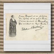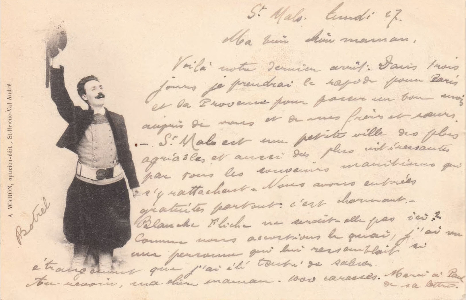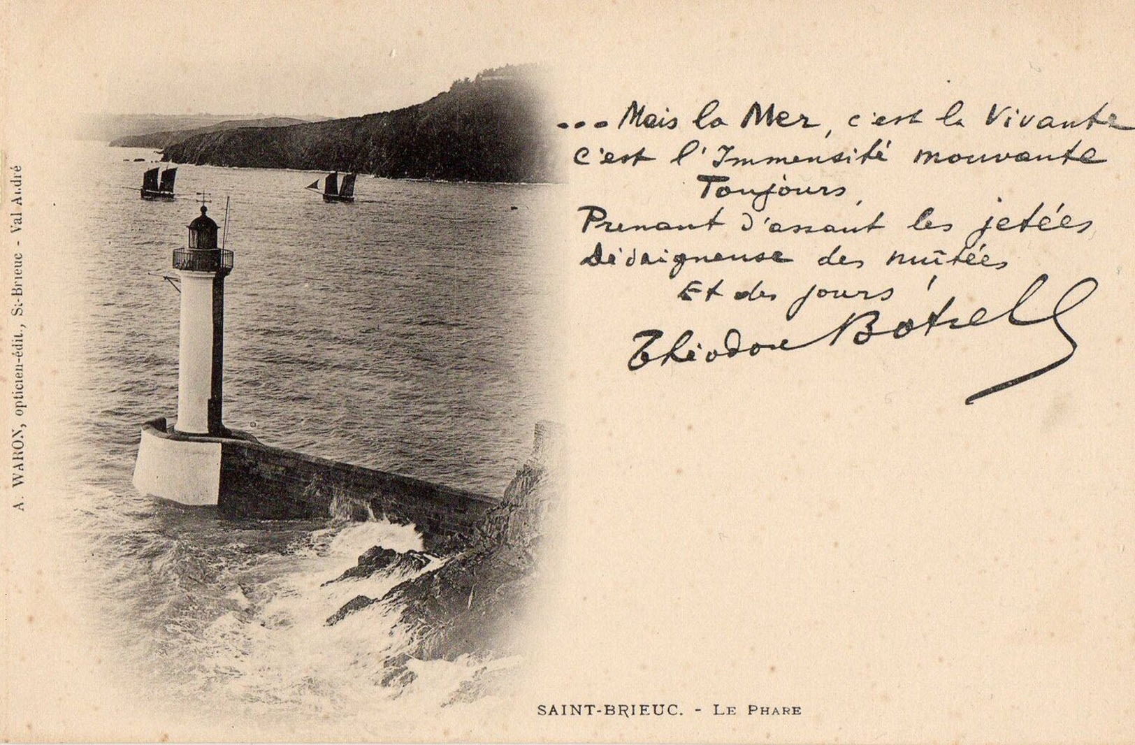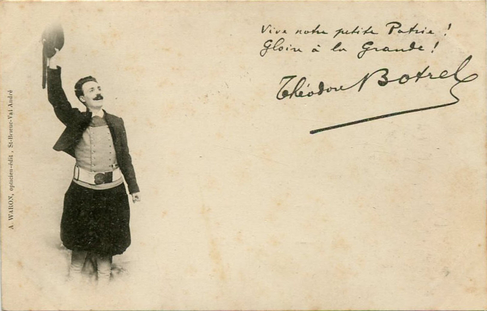 Toujours dans cette période de ses débuts d' éditeur, on trouve des cartes reprenant des textes écrits par Théodore Botrel (1868-1925), rendu célèbre grâce à sa chanson folklorique La Paimpolaise créée en 1895. Pour plus d' information sur Botrel, voir Jean-François Botrel, « Théodore Botrel, chansonnier politique », in D. Leloup, M.-N. Masson (dir.), Musique en Bretagne. Images et pratiques. Hommage à Marie-Claire Mussat, PUR (Rennes), 2003, p. 149-159, consultable ici. Voir également Katell Mouazan, Enquête sur le véritable Théodore Botrel, 2018, (ISBN 978-2-9564897-0-2). Quelques exemples des premières cartes Waron avec textes de Botrel, dont ce dernier se servira pour sa publicité (carte n⁰ 2 avec autographe). Tout comme Hamonic, également très lié avec Botrel dont il fera le sujet de diverses séries (Botrel à Port-Blanc, Botrel au Canada, Les chansons de Botrel...), les premiers clichés ne sont pas numérotés (carte n⁰ 3 à 5 et série La Paimpolaise) mais ils le deviennent rapidement, certains étant réutilisés ultérieurement. Pour exemple, la Paimpolaise du cliché d' Albert Durand, et carte n⁰ 1 de la série de 6, qui se retrouve dans les clichés des cartes n⁰ 18 (4b) et 19 (1004). À ce propos, certaines cartes sont identifiables à la période de la fin du 19e siècle, tout début du 20e, en ce qu' elles mentionnent le photographe, ce dernier disparaissant des éditions ultérieures. Autre signe caractéristique des cartes Waron, mais aussi de celles d' Hamonic, la mention en breton au dos des cartes, laquelle disparaît dans la deuxième moitié de la décennie (voir à ce sujet ma page sur la Datation des cartes postales anciennes ici). C' est le cas dans la série La Paimpolaise du diaporama (cartes n⁰ 6 à 15) et les dos des cartes n⁰ 10 et 13 qui correspondent aux deux cartes précédentes (III et IV dans la série).