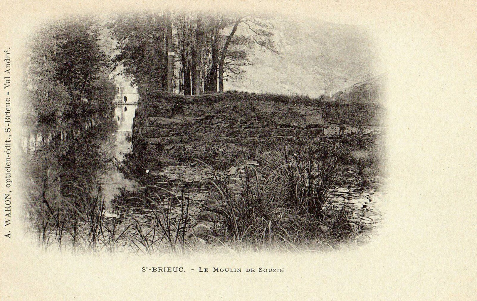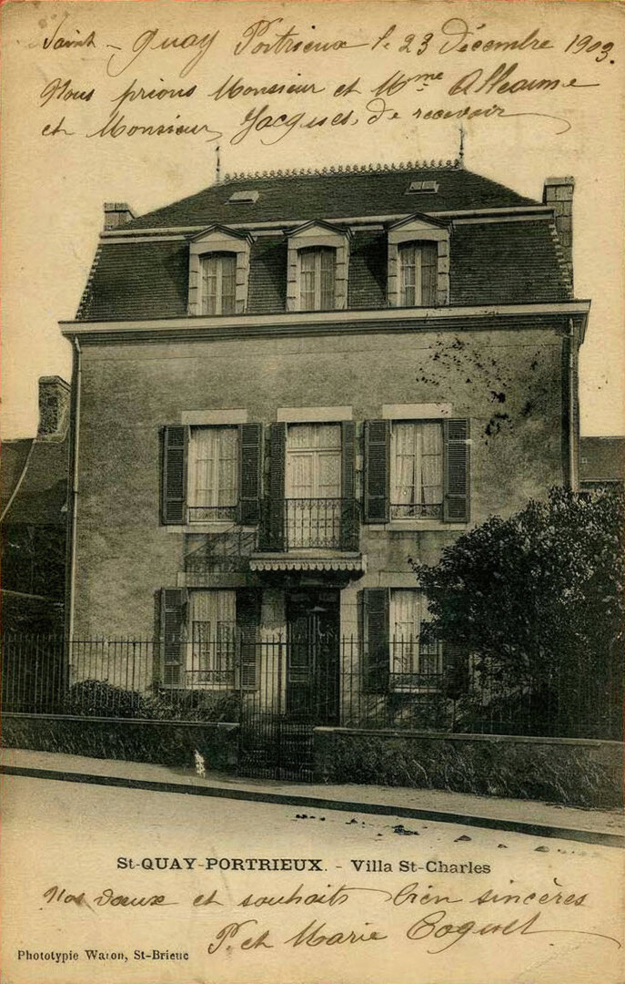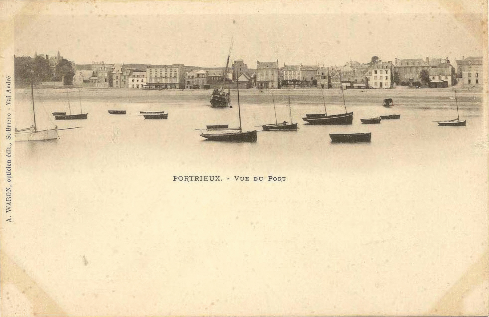 En 1899, Waron ouvre également une succursale à Pléneuf-Val-André, rue Saint-Symphorien juste à côte de la poste (pratique !), qui fonctionnera durant la saison touristique, ce qui explique notamment la mention english spoken de ses premières publicités (supra). N' oublions pas que les Anglais colonisent Dinan et Dinard à la fin du 19e siècle et que ce sont ces derniers qui ont fait de Dinard une station balnéaire à la renommée internationale, et qui ont marqué l' architecture de ses villas avec des éléments très 'British' tels le bow-window, la véranda, la fenêtre à guillotine ou encore les charpentes apparentes lambrissées. En ce qui concerne les inscriptions des premières cartes, on retrouve toujours la mention A. WARON, opticien-édit., St-Brieuc ou St-Brieuc. Val André, ayant en ma possession deux exemplaires de 1899 confirmant cette dualité au niveau de la localisation indiquée. Elles apparaissent ensuite sous la mention Collection A. Waron, St-Brieuc et assez rarement Phot. A. Waron, St-Brieuc. À la même époque, que j' estime de manière empirique être l' année 1901, il édite quelques cartes dans un cartouche Collection A. WARON, St-Brieuc, horizontal ou vertical, comme cet exemplaire ci-contre illustrant les goélettes islandaises dans le port de Paimpol, un cliché de Charles Torty, que je possède également circulé en 1901 (aucune carte 'cartouche' vue circulée en 1900 à ce jour). Il abandonnera rapidement ce format puisqu' on ne le retrouve sur aucune carte La Bretagne Pittoresque, collection lancée en 1902 (infra). Enfin, en ce qui concerne les dos, voir la page Datation des cartes postales anciennes ici pour plus de détail que ce qui est dit au paragraphe précédent.