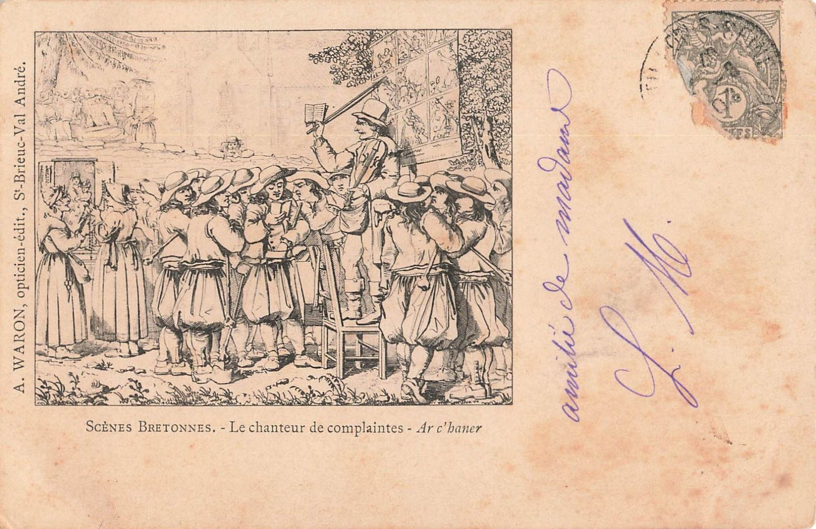 La série des Scènes bretonnes va préfigurer la collection La Bretagne Pittoresque, abordée à la page 2 de la biographie de Waron. Avant cela, il faut ici parler de l' importance du folklore breton, de François Jaffrenou, dit le barde Taldir, et de l' Union Régionaliste Bretonne (URB) fondée en 1898, puisque les travaux de Waron s' inscrivent non seulement dans son temps, mais sont aussi influencés par l' exemple donné par son collègue Émile Hamonic, premier à avoir inscrit la mention 'KARTEN BOST' en application des recommandations de l' URB. Jaffrenou déclare à propos d' Hamonic qu' « il n’ est donc pas que des bardes et des littérateurs s’ occupant du mouvement breton, car voilà deux œuvres, celle de Le Moal et d’ Hamonic, qui sortent de la vulgaire banalité, et qui ordonneront un sérieux coup de main au journal et au livre. Le Moal et Hamonic nous fourniront à nous autres, les ouvriers, le ciment nécessaire, le mortier qui unifiera et solidarisera les multiples éléments de nos travaux divers. Un mouvement si nettement tracé ne peut pas ne pas réussir » (« Politique nouvelle », dans Ouest-Éclair, 19 décembre 1900, p. 1). Peu de temps après avoir fondé son imprimerie en août 1904, Jaffrenou écrit en novembre dans son journal, « Nous rappelons à nos lecteurs qu’u n autre titre de gloire, pour M. Hamonic, est qu’ il a été le premier éditeur de cartes postales de sujets bretons à rédiger en breton le recto des dites cartes. La Karten Bost a été lancée par lui, ceci dit sans atténuer en rien le mérite de notre ami M. Villard, de Quimper, qui lui aussi a adopté cette appellation » (« La Bretagne, terre classique des cartes postales illustrée » Ar Bobl, 5 novembre 1904, p. 1.) (Chmura).