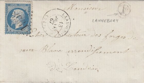 Juste une lettre de 1867 avec un Napoléon bleu à 20 cts. Avec l' apparition du cachet de la poste, les bureaux ont une marque qui identifie la provenance des lettres. Celle-ci est postée avec le cachet de Lanvollon mais avec la marque F correspondant à Lannebert.