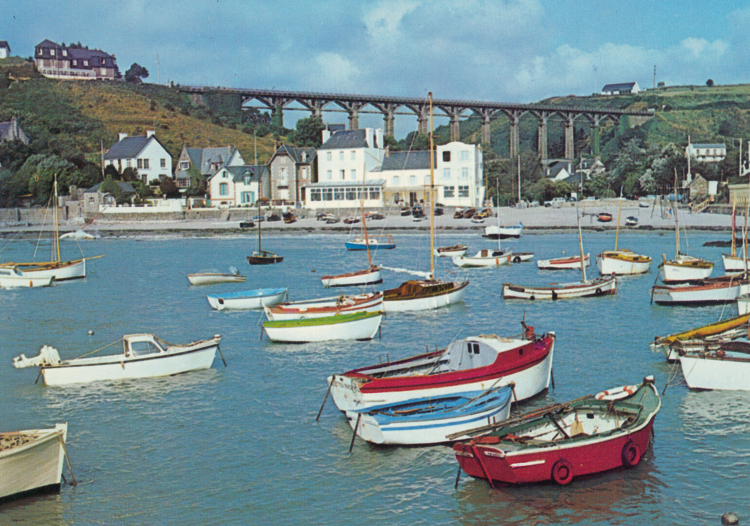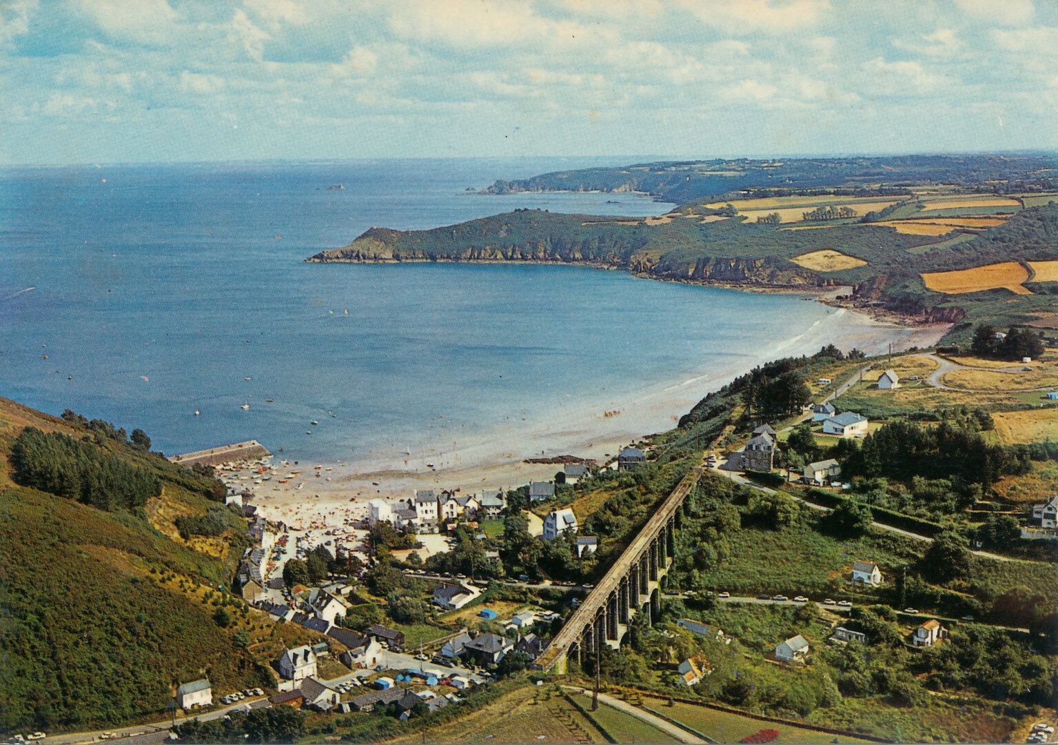 Contrairement à ce que dit Wikipédia et le site du patrimoine culturel de Bretagne, le viaduc a bien été démoli en 1973/74 (et non 1972). Internet ne raconte pas non plus le pourquoi du démantèlement. Rappelons que la ligne prit fin le 31 décembre 1956, la dernière du 2ème réseau des Côtes-du-Nord à fermer. Ce qui signifie que le département devait entretenir un réseau qui ne servait pas. Malheureusement, la mode n'était pas encore au retour de locomotives à vapeur comme celle de la Vapeur du Trieux, qui emmène les touristes de Paimpol à Pontrieux. Nul doute que si le viaduc et la ligne avaient survécu, ils feraient aujourd'hui les beaux jours du tourisme local. Dans les années 70, ce n'était pas dans l'esprit du temps. L'événement déclencheur fut qu'en 1972 des pierres se détachèrent du viaduc et tombèrent juste devant l'autocar de ramassage scolaire. L'entretien coûtant cher au Conseil départemental, et vu les risques d'éboulement, il fut décidé de démanteler le viaduc, bien que de nombreuses voix s'y opposèrent à l'époque (article de presse de 1972, source inconnue), mettant en avant la nature remarquable de cet ouvrage d'art. Les pierres récupérées servirent lors de l'extension de la digue en 1975.En ce qui concerne les carte postales et photos proposées ici, les cartes n⁰ 1 et 2, photo Le Merle, date de 1913, peut-être début 1914. On voit que les piles ont avancé, mais qu' elles ne le sont pas encore autant que sur les cartes n⁰ 3, 4 et 5 de Barat, qui datent de 1914 (si vous connaissez la 1320, dites-le moi !). Les cartes de Barat sont exceptionnelles car elles présentent des personnages (carte référencée 1317), dont le douanier que vous pouvez retrouver sur les cartes d' Hamonic (section 1901-1910). Au pied du Viaduc se trouve l' Hôtel Guillerm et le café parisien attenant. La référence 1319 montre la maison Dauphin, du nom d' un ancien notaire de Plouézec, habitant au Questel, connu pour avoir eu la première automobile sur Plouézec vers 1920 ! (souvenirs de Louis Le Floc'h racontés à l'occasion du centenaire du Petit Train, et carte Couée référence 202). Cette maison est encore dans sa première mouture avant démolition et reconstruction en pierres dans les années 20. On y voit aussi la guérite du douanier (actuel bureau du port) et la cabane du tailleur de pierre sur le terre-plein central. La référence 1921 montre les premières constructions du front de mer, l' Hôtel de la Plage originel, à droite bien sûr.