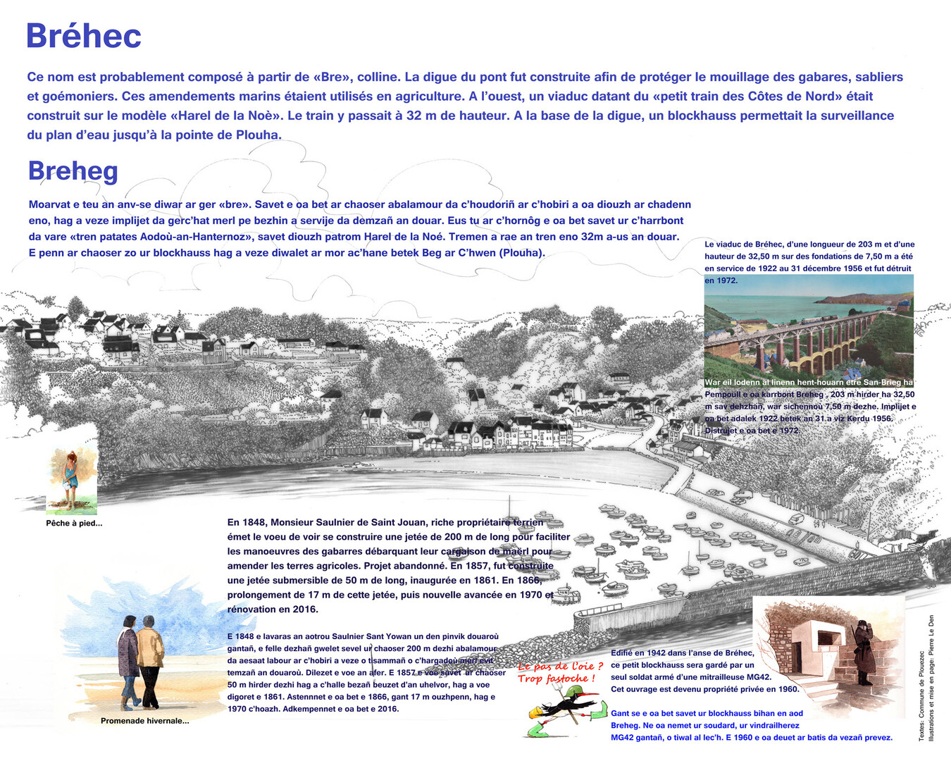 Pierre Le Den est illustrateur-plasticien. Titulaire d'un diplôme d'architecte-paysagiste, il est concepteur d'aménagement extérieur et il réalise des fresques, illustrations, maquettes pour des expositions et des musées. Il enseigne également l'art plastique. Son site Web se trouve ici.Pour le projet de réaménagement de Bréhec et la création du Village marin, il lui fut demandé de concevoir des illustrations servant à la réalisation de panneaux d'information, et notamment une grande banderole qui résume la vie commerçante et sportive de Bréhec. Il est à noter que les illustrations de Pierre bénéficient d'une présentation bilingue, puisque les légendes ont également été écrites en breton, une réalisation de la commune de Plouézec. Merci à Pierre d'avoir bien voulu me fournir des photographies de certains croquis et affiches utilisés pour la signalétique du Village marin. Vous pouvez ainsi voir les illustrations en détail dans le diaporama à côté des panneaux in situ (photos © Pierre Le Den et photos in situ © Anse de Bréhec).