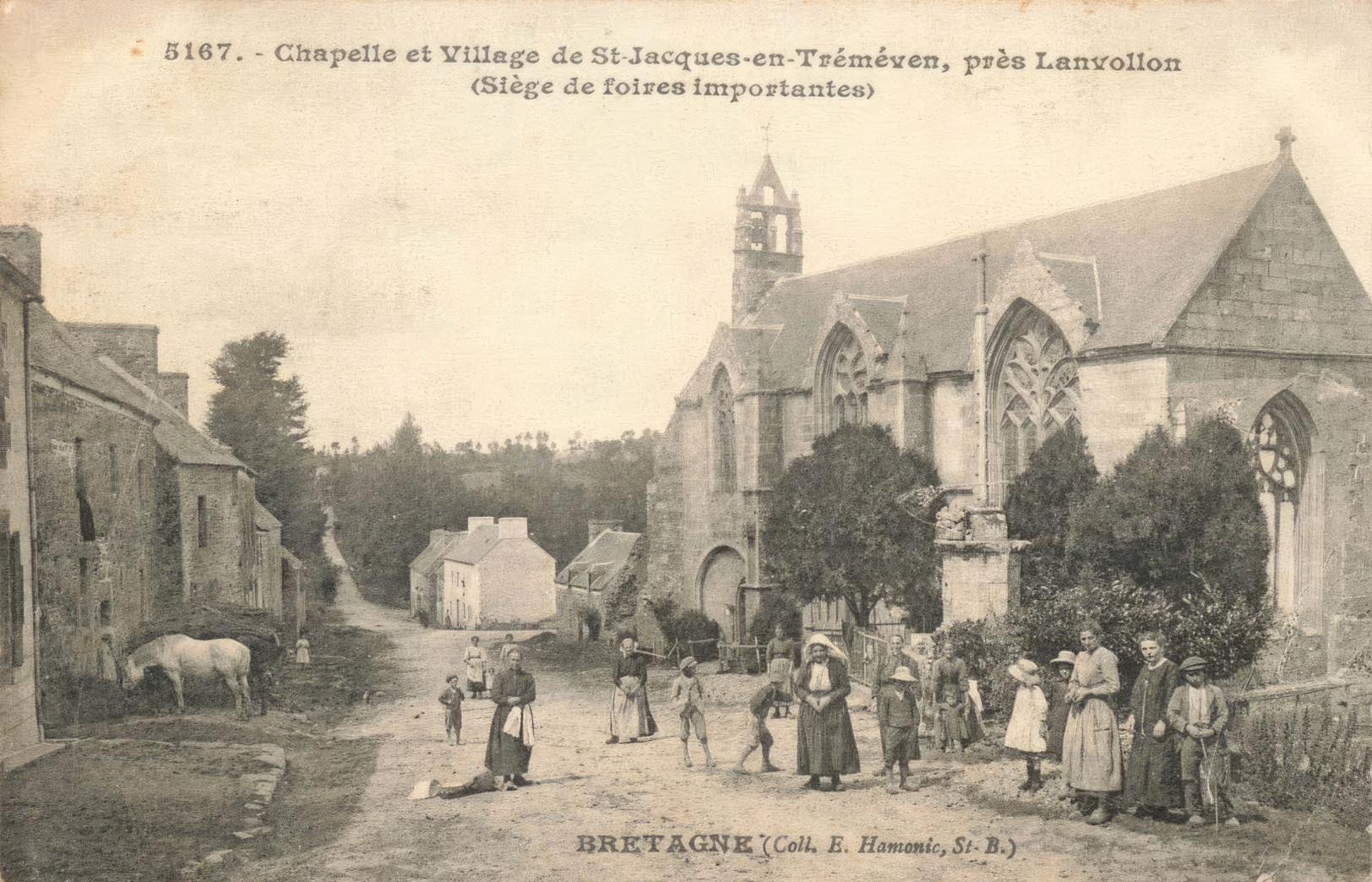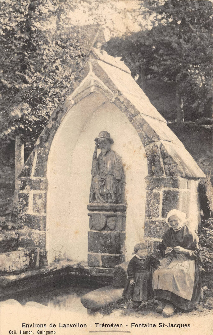 Jean-Baptiste Barat revient vers 1912 pour le cliché de l' intérieur de la chapelle (n⁰ 1346) puis l' année d'après pour la série plus conséquente qui nous fournit un aperçu du village et des autochtones à cette période. Ce dernier est complété par les cartes postales d' Émile Hamonic (biographie ici) qui prend ses clichés également vers 1912-1913 et dont les intitulés des cartes nous racontent la légende de la statuaire de la chapelle. Je n' ai aucune information sur la carte-photo du café-restaurant de la Lande-St-Jacques et la mention Vinet, autre que la date de circulation de 1913. On imagine que l' enseigne indique la présence d'un terrain de boule bretonne.